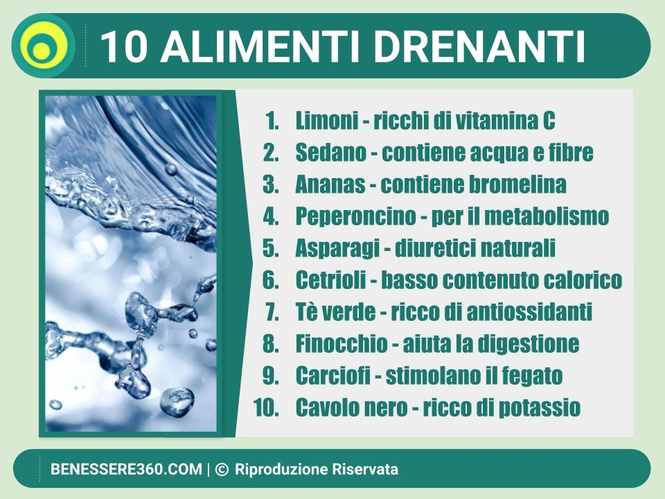 L'effetto drenante degli alimenti è dovuto al loro contenuto di acqua, fibre e nutrienti che aiutano a stimolare il sistema linfatico e il metabolismo.