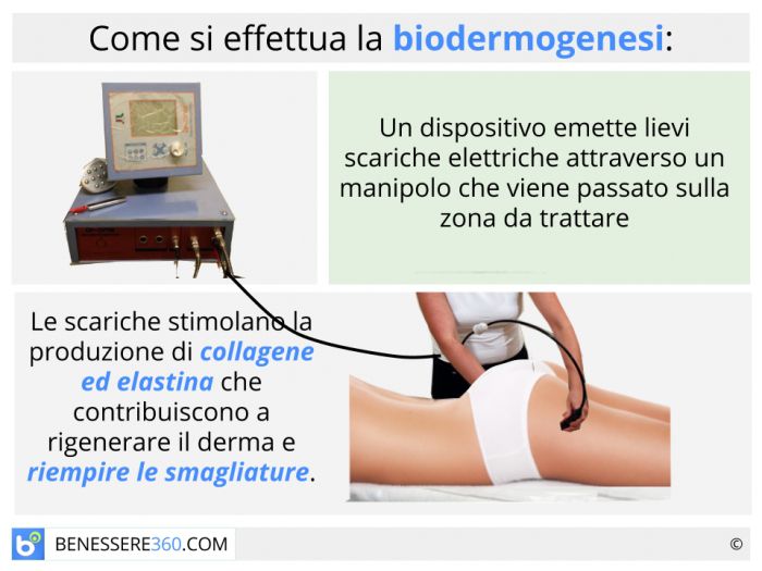 Rispetto alle altre tecniche, la biodermogenesi non interviene sulle striature solo a livello esteriore, pur non usando metodi invasivi; infatti, le cariche emesse dal macchinario agiscono direttamente sull’attività cellulare, stimolando i fibroblasti che incrementano la produzione di collagene ed elastina che riempiono i solchi riportando le strie allo stesso livello della pelle circostante.