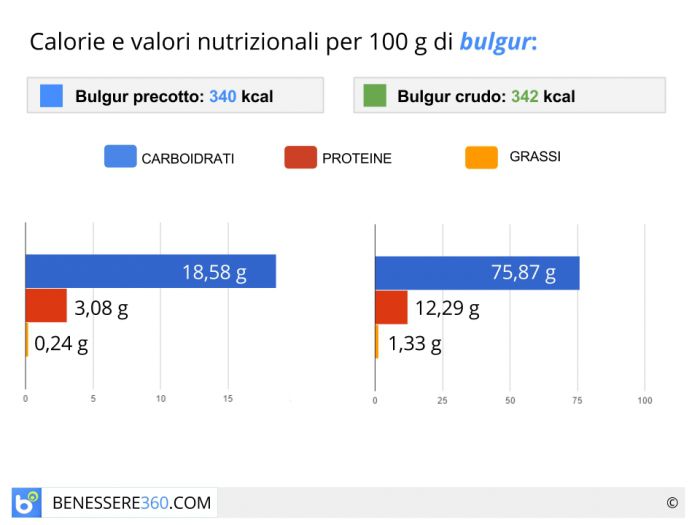 La pozione media per entrambi i tipi di bulgur si aggira intorno a 80 grammi a crudo, ossia prima della cottura e dell’ammollo. Una volta cotto i due tipi di bulgur apportano mediamente 80 chilo calorie per porzione. Per i diabetici il peso per porzione si aggira intorno ai 50 grammi.