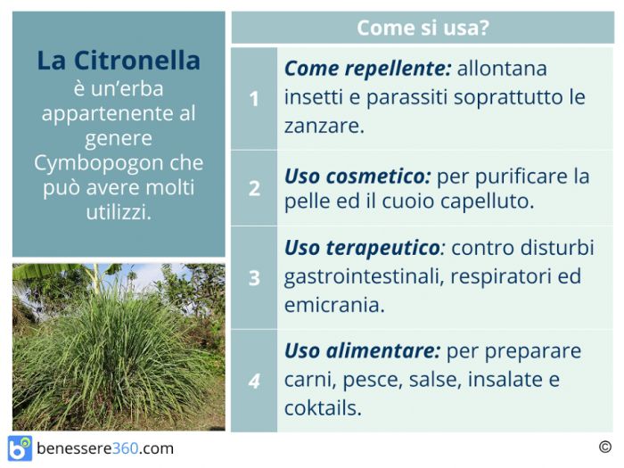 La citronella, conosciuta soprattutto come rimedio antizanzare, é un’erba dalle svariate proprietà , alcune delle quali oggetto di numerosi studi. Scopriamone gli usi e gli effetti collaterali.