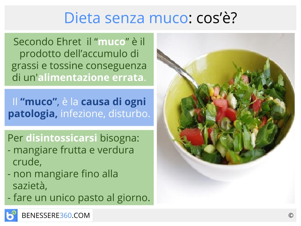 Dieta senza muco: un sistema alimentare ideato dal signor Ehret per depurare l'organismo da quella che lui considera la causa di tutti i disturbi e le patologie. Ma cos'è il muco? E cosa mangiare per evitarne la formazione? Approfondiamo tutti gli aspetti di questa dieta alquanto restrittiva analizzandone anche i pro ed i contro attraverso le opinioni di chi l'ha provata e di chi invece la critica.