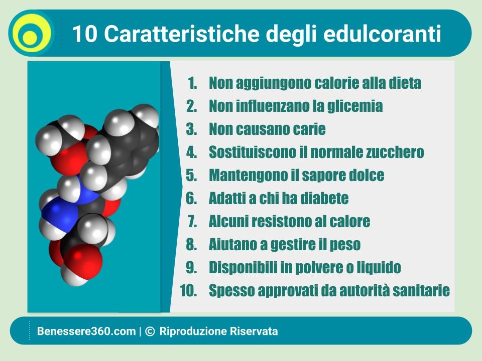 Sono caratterizzati di solito dall’avere un notevole potere dolcificante accompagnato da un apporto calorico nullo, cioè non vengono utilizzati per produrre energia, ma nella maggior parte dei casi lasciano il nostro corpo immodificati, nelle urine. L’aspartame rappresenta un’eccezione rispetto a quanto detto sopra, infatti viene scisso nei suoi componenti e dà un apporto calorico simile a quello del saccarosio (ma se ne usa molto meno).