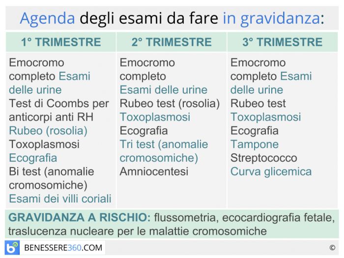 Il primo trimestre di gravidanza va dalla data del presunto concepimento fino alla 13° - 14° settimana. Durante questa fase, che è anche una delle più delicate della gravidanza, è bene sottoporsi ad una serie di esami per accertarsi che tutto proceda correttamente e per individuare in tempo utile i possibili rischi in modo da poter intervenire in modo adeguato, in particolare è necessario sottoporsi a: