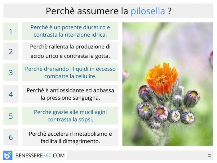 Famosa per essere un potente diuretico, come accennato, la pilosella viene efficacemente utilizzata per combattere la ritenzione idrica, la cellulite e nelle diete depurative, proprio perché capace di sollecitare la funzione renale grazie ai suoi principi attivi.