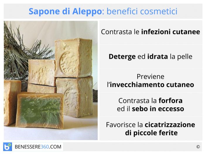 Grazie alle proprietà dell’ olio di oliva e dell’olio di alloro, il sapone di Aleppo può apportare diversi benefici a livello cosmetico e può essere usato per molte preparazioni di bellezza. In alcuni casi può essere usato anche per preparazioni non cosmetiche.
