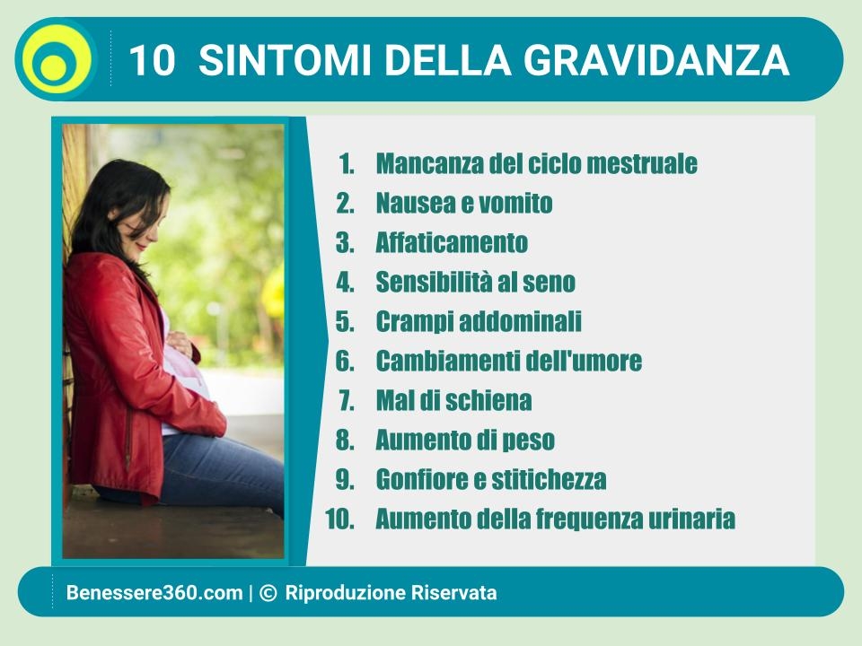 I primi sintomi di gravidanza variano da persona a persona e da gravidanza a gravidanza, ma alcuni segnali precoci includono l'assenza del ciclo mestruale, sensazione di nausea, vomito, stanchezza, affaticamento, aumento importante della frequenza urinaria, sensibilità al seno, dolori all'addome, cambiamenti dell'umore e altri sintomi meno diffusi. Tuttavia, questi sintomi non sono sempre presenti e vengono confusi con altri disturbi.