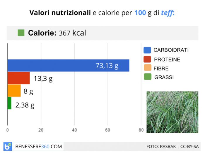 100 grammi di teff apportano un’energia pari a 367 kcal.