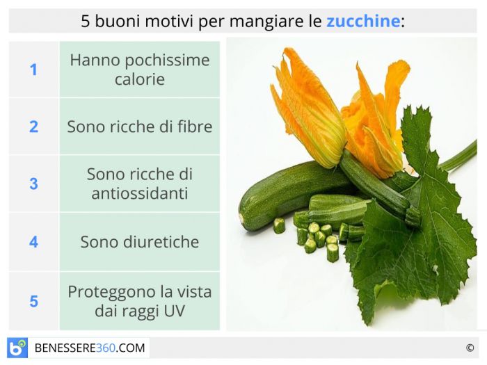 Leggere e dal gusto delicato, ideali per la preparazione di qualsiasi piatto in cucina, le zucchine sono conosciute per le spiccate proprietà diuretiche dovute alla presenza di notevoli quantità di acqua e di potassio, elementi che a livello renale, favoriscono l’escrezione di urina contrapponendosi all'azione del sodio che, invece, promuove la ritenzione idrica. La potente azione diuretica di questo ortaggio e il fatto che, essendo pieno d’acqua, è particolarmente ipocalorico, rendono il consumo di zucchine utile in alcuni casi.